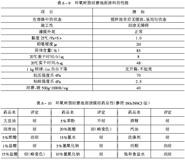 某企業(yè)生產(chǎn)的環(huán)氧樹脂耐磨地面涂料的技術(shù)性能要求如表6-9、表6-10所示。因只是企業(yè)產(chǎn)品標(biāo)準(zhǔn),這里只作為示例列出,不再列檢測(cè)方法。