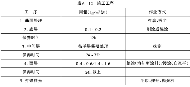 環(huán)氧樹脂耐磨地面涂料的涂裝工序主要有以下步驟,如表6-12所示。