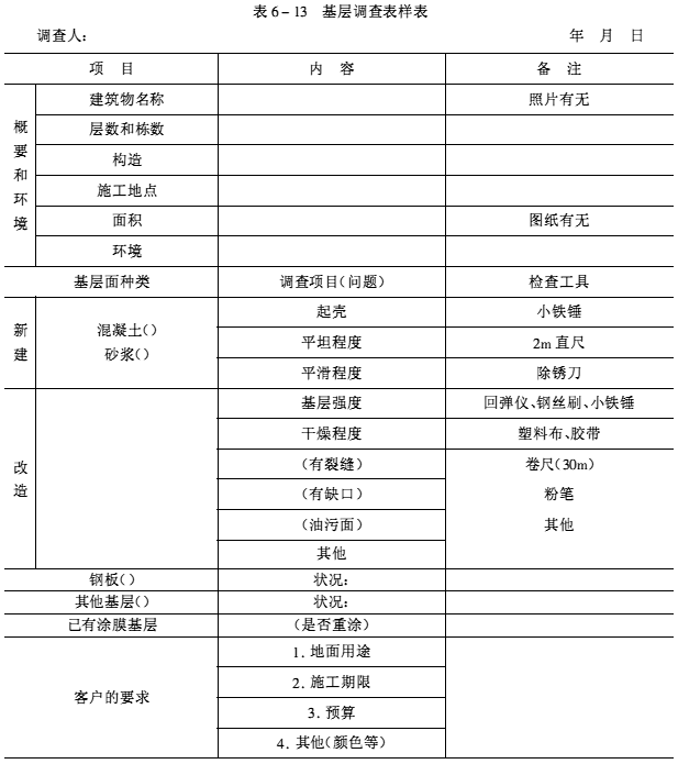 2)基面狀況調(diào)查 通過現(xiàn)場(chǎng)檢測(cè)工具對(duì)工作面進(jìn)行全面細(xì)致的檢查,并做好詳細(xì)記錄(參考樣表,見表6-13)。地面施工屬隱蔽工程,基層面狀況務(wù)必調(diào)查清晰、紀(jì)錄完整(可分解成多張圖紙)。基層面的尺寸要單獨(dú)表明在圖紙上(精確到厘米)。