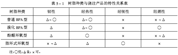 用于澆注的環氧樹脂以BPA型樹脂為主。通常使用相對分子質量在1000以下的中、低相對分子質量的樹脂。由于環氧樹脂必須同固化劑及其他添加劑固化成型后,才能呈現出其材料的特性。因此固化劑和其他添加劑也同樣影響澆注件的性能。單就環氧樹脂而言,相對分子質量越大,其澆注產品的韌性越好,在要求澆注產品有一定機械強度和韌性的用途中,通常選用相對分子質量在500~1000的固體樹脂。在要求有較好的加工操作性能時,常使用相對分子質量低于500的液體樹脂或液體樹脂與固體樹脂混用。為了提高耐熱性能,可以采用添加多功能團的環氧樹脂。如酚醛環氧樹脂。為了提高阻燃性能,可以添加鹵素化環氧樹脂。為了提高耐候性能,可以選用脂環族環氧樹脂。不同環氧樹脂與其澆注產品的特性關系見表5-1。