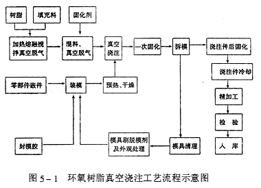 真空澆注工藝是目前環氧樹脂澆注中應用最為廣泛、工藝條件最為成熟的工藝方法。環氧樹脂真空澆注常見的工藝流程示意圖見圖5-1。