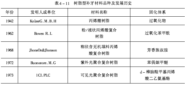 樹脂型補牙材料及其歷史發展見表4-11。