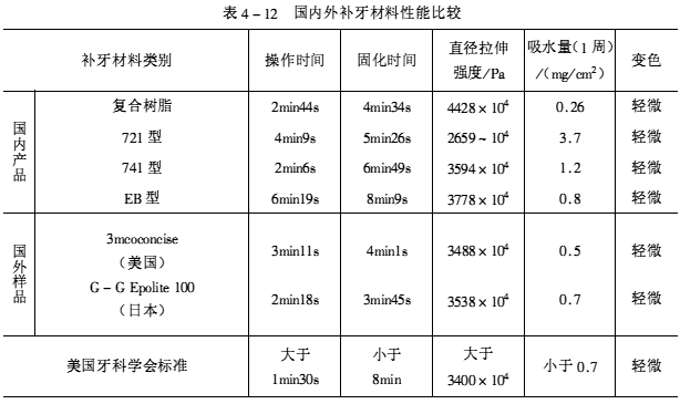 表4-12和表4-13列出了國內外幾種樹脂型補牙材料的性能比較。