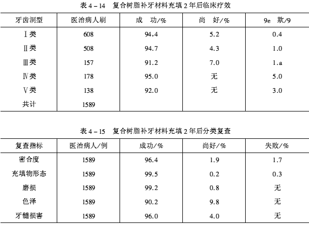 復合樹脂充填牙齒窩洞的方法是:把調和好的補牙材料用塑料充填器迅速充入窩洞內,一般先將牙齒釉角釉壁充滿,然后再將整個洞充填。充填應在1min內完成,充填后靜等3min,不可再攪動充填體,使聚合反應在口腔溫度條件下自然完成。復合樹脂完全聚合要6~7min,聚合后取出隔離片,對需磨改的部位可用蘸水小圓石或金剛砂輪修磨,以恢復形態。復合樹脂補牙材料充填2年后臨床療效見表4~14。