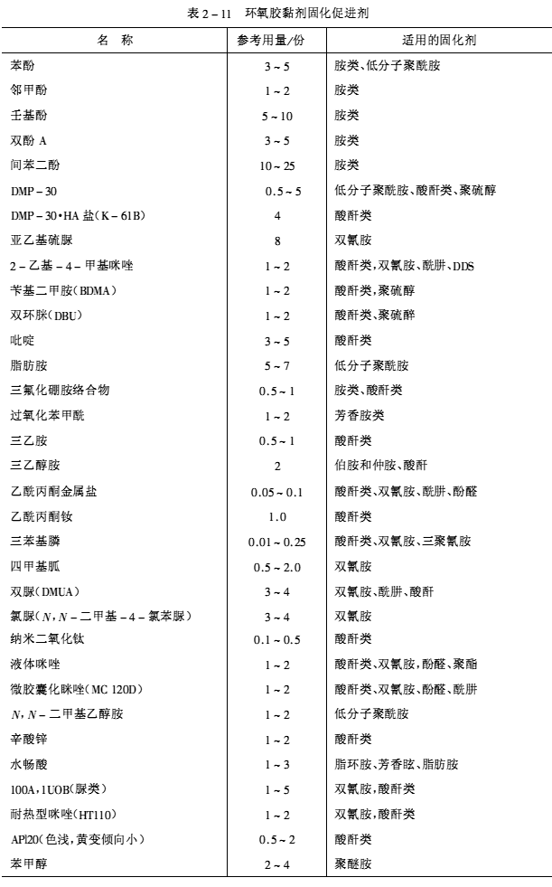一些重要的環氧膠黏劑固化促進劑列于表2-11。