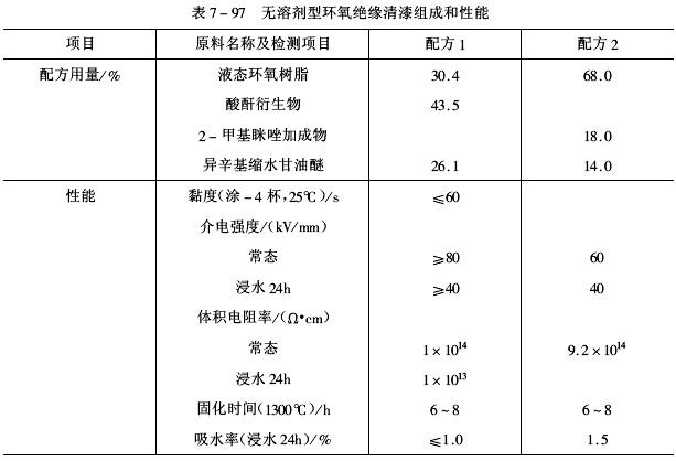 采用環氧樹脂作基料制備的無溶劑型環氧絕緣浸清漆已獲廣泛應用。兩種配方組成的無溶劑型環氧絕緣清漆組成和性能列于表7-97。