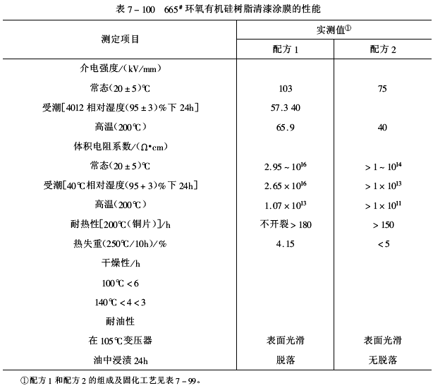 665#環氧有機硅樹脂清漆配方及固化工藝見表7-99,性能見表7-100。