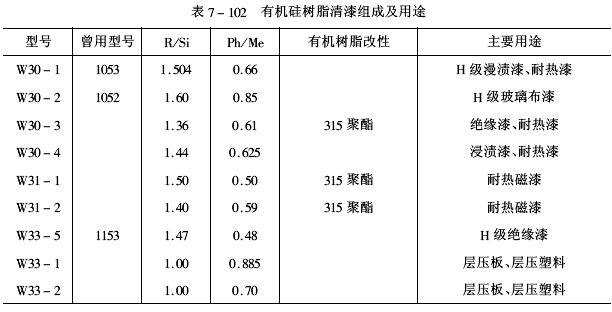 國內幾種有機硅樹脂清漆組成及用途見表7-102。