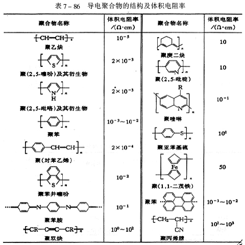 導電聚合物的結構及體積電阻率見表7-86。