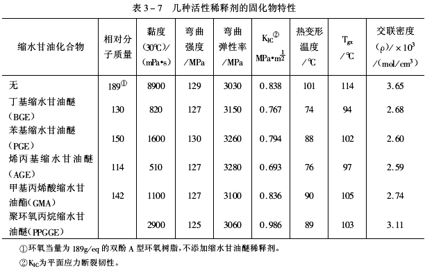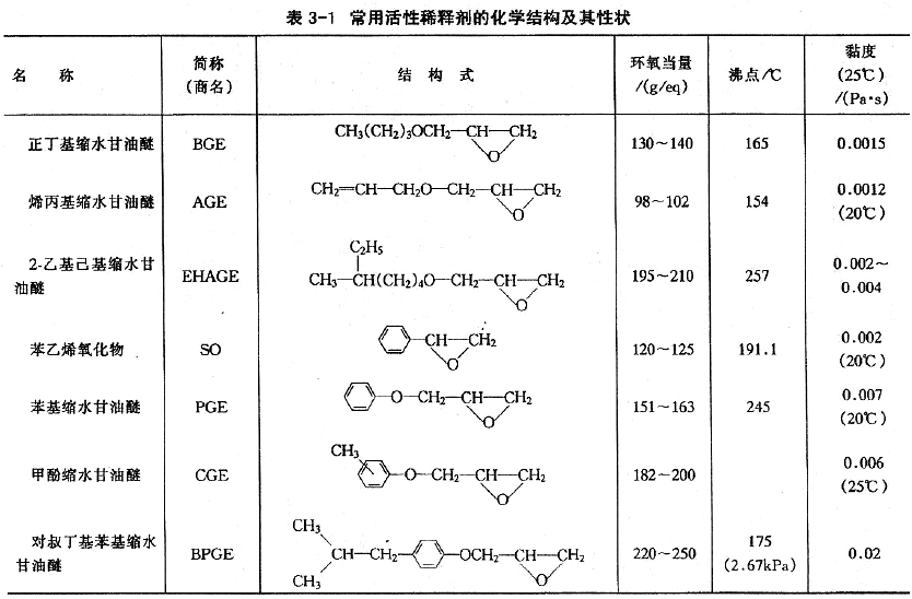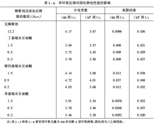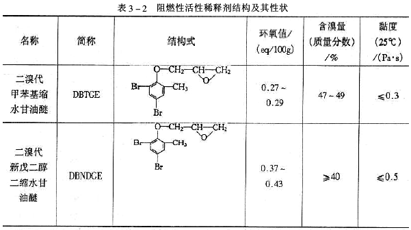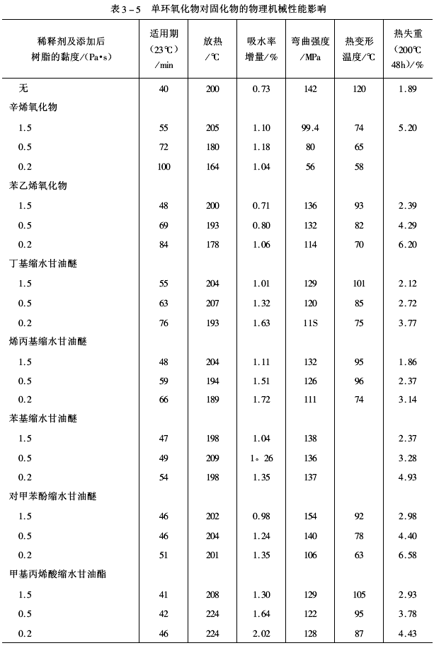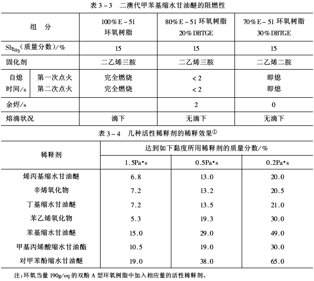 常用活性稀釋劑的化學結構及其性狀見表3-1、阻燃性活性稀釋劑結構及其性狀見表3-2、二溴代甲苯基縮水甘油醚(DBTGE)的阻燃性見表3-3、幾種活性稀釋劑的稀釋效果見表3-4、單環氧化物對固化物的物理機械性能影響見表3-5、單環氧化物對固化物電性能的影響見表3-6、幾種活性稀釋劑的固化物特性見表3-7。