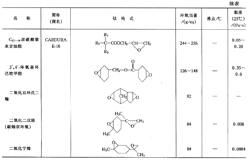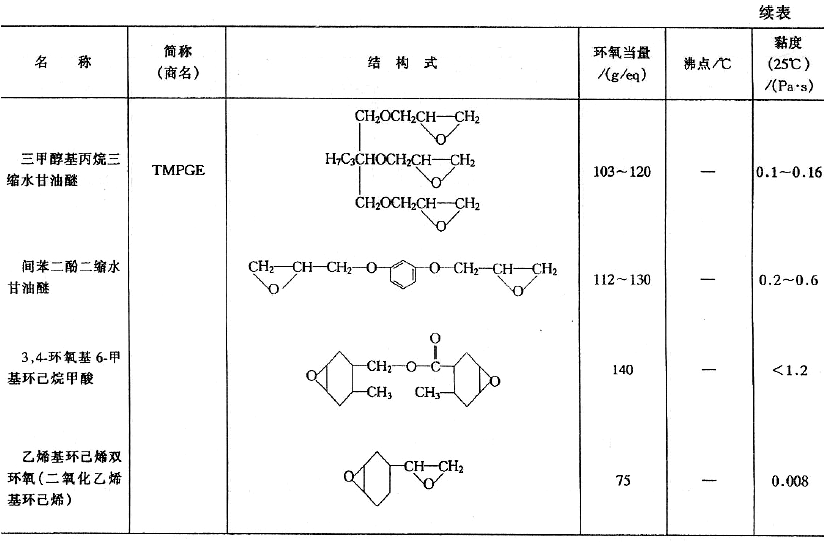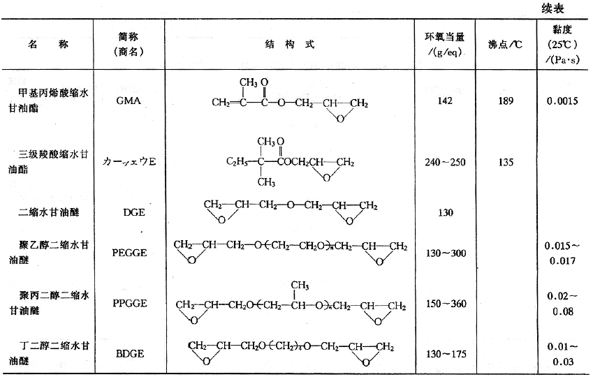 (1)活性稀釋劑活性稀釋劑是一種低分子、低黏度、能參與交聯固化成膜的環氧化物。丁醇、異辛醇、苯酚、烷基酚和高級一元醇的縮水甘油醚,一元脂肪酸縮水甘油酯等是常用的單官能度活性稀釋劑;丙二醇和乙二醇的二縮水甘油醚是雙官能度活性稀釋劑;三羥甲基丙烷三縮水甘油醚是三官能度活性稀釋劑。