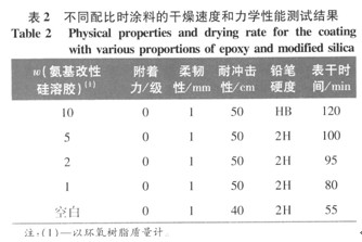 從圖2中看出,對于純環氧涂層,加熱超過 2.3有機一無機雜化涂基接觸角分析 空白環氧清漆涂層表面的接觸角為45.56。,而有機一無機雜化清漆涂層表面的接觸角為51.89。(圖略)。表明加入氨基改性硅溶膠后,涂層表面的接觸角變大,涂層憎水性明顯增加。導致接觸角變大的原因是硅烷偶聯劑KH -550中的烷氧基固化過程中有向表面富集的趨勢,從而導致對水接觸角增大[8]。 2.4有機一無機雜化涂層干燥時間及力學性能測試 氨基改性硅溶膠帶有的氨基基團與環氧樹脂的環氧基團混合后發生交聯固化。有機相與無機相雜化作用的結果,可提高以環氧樹脂為基體的涂層綜合力學性能。本研究按照氨基改性硅溶膠與環氧樹脂的不同配比制備的有機一無機雜化涂層進行比較實驗,使用馬口鐵板作為基材,測試結果如表2.