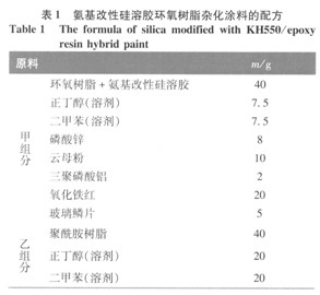 摘要:通過溶膠—凝膠法制備氨基改性硅溶膠,并將其摻混改性E—44環氧樹脂以得到硅溶膠改性環氧復合涂料。利用紅外光譜(FT—IR)、接觸角、熱重(TGA)等對所得涂層進行分析測試。結果表明:當加入的改性SiO2硅溶膠占環氧樹脂含量為2%~5%時,涂層的附著力、硬度、耐沖擊性、柔韌性等較好,同時涂層的耐酸、耐堿、耐汽油、耐蒸餾水、耐鹽水效果也達到實際使用標準,雜化涂層中SiO2與環氧樹脂兩相間存在化學鍵及氫鍵作用,有機—無機雜化交聯的結果,可提高涂層的耐高溫及防腐蝕性能。 關鍵詞:溶膠—凝膠法,環氧樹脂,復合涂料,性能,電化學 環氧樹脂具有優良粘結性、耐磨性、電絕緣性、耐高低溫性、耐化學藥品性,同時具有附著力好、力學性能優良以及收縮率低、易加工成型和成本低廉等優點[1],是作為金屬防腐蝕涂層的良好材料。但純環氧樹脂固化后呈三維網狀結構,交聯密度高,存在內應力較大、質地硬脆、耐開裂性差、耐沖擊性不強和耐濕熱[2]不佳等問題。本課題組曾經通過溶膠凝膠法制備有機一無機雜化材料改性水性丙烯酸鐵紅涂料[3]。受此啟發,本研究制備硅烷偶聯劑氨基改性硅溶膠,使其帶具有反應活性的氨基基團,將其摻入環氧樹脂低聚體中,樹脂加入固化劑后經熱固化交聯,得到有機一無機雜化涂層。在雜化體系中,帶有氨基基團的硅溶膠與環氧樹脂組成有機一無機雜化結構,可提高有機環氧相與無機Si02凝膠相的相間相容性,并提高了體系整體性能[4-7]。 1 實驗部分 l.l 實驗材料 E -51環氧樹脂:工業級,藍星新材料無錫樹脂廠;聚酰胺樹脂:工業級,江蘇鎮江柏穗化工;正硅酸乙酯( TEOS)、無水乙醇、乙酸乙酯:均為分析純,上海中試;硅烷偶聯劑KH -550(y-氨丙基三乙氧基硅烷):杭州沸點化工;三聚磷酸鋁:工業級,石家莊鑫盛化工;硫酸鋇:化學純,七海泗聯化工;氧化鋅:化學純,上海勒業化工;氧化鐵紅:安徽中意漆爾思防腐顏料廠。 l.2實驗儀器 BYK Gardner型附著力測試儀、涂膜硬度鉛筆測定儀、QTY-32型漆膜彎曲試驗器:均為天津偉達測試機廠生產;Q153-3K1型沖擊器;FT-5200型紅外光譜儀:美國DICILAB公司;Pyris Diamond型熱重分析儀;JC2000D1型接觸角測量儀:上海中晨數字技術設備有限公司;EG&G M283型電化學綜合分析測試系統:美國EG&G公司。 1.3實驗流程 將TEOS溶于一定量的無水乙醇/乙酸乙酯中,向體系中緩慢加入一定計量的硅烷偶聯劑KH-550及蒸餾水并充分攪拌,由于KH-550中帶有氨基,其具有自催化效應,滴加完畢后在 首先將氨基改性硅溶膠與環氧樹脂按照凡(氨基改性硅溶膠):n(環氧樹脂)的不同比例(1%、2%、5%、10%)加入到m(正丁醇):m(二甲苯)=1:1的混合溶劑中,加熱90 qC回流,反應2h,再加入表l配方設計所設定的各種顏填料,激烈攪拌分散均勻。配漆前,將計算量的聚酰胺樹脂固化劑溶解在其中。放置0.5 h后,涂覆于打磨去油的馬口鐵板上,常溫干燥揮發溶劑后,再在