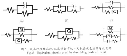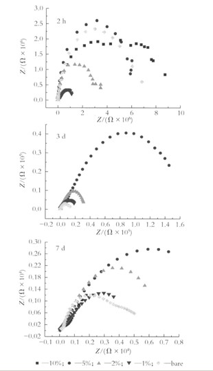 圖4為浸泡不同時間的氨基改性硅溶膠/環氧樹脂有機一無機雜化色漆及空白環氧色漆Nyquist圖。 在浸泡ld、3d時,3.5% NaCl溶液開始慢慢浸透環氧色漆涂層,NaCl溶液從涂層孔道進入涂層的速度遠小于NaCl溶液在界面處生成腐蝕產物的速度。因界面處不溶性腐蝕產物濃度高,腐蝕產物向溶液中擴散,此時擴散控制腐蝕過程。圖4中的Nyquist為一圓弧拖尾線性擴散,其中高頻區的圓弧對應涂層的信息,低頻對應界面處信息。隨著浸泡時間的延長,越來越多的電解質溶液到達界面,此時電解質與腐蝕產物膜之間形成容抗模型,擴散特征消失,因而到了浸泡7d時,Nyquist圖的Warburg尾消失,逐漸變為直徑很大的容抗弧,此+時涂層可作為一個屏蔽層,隔絕腐蝕介質與基體的直接接觸,保護基體金屬免受腐蝕的作用。隨著浸泡時間的加長,腐蝕性介質傳輸到達涂層/金屬界面,電解質溶液對涂層的滲透已經達到飽和,建立起腐蝕微電池,腐蝕反應已經發生,使得基底金屬腐蝕的同時還破壞著涂層與基底金屬之間的結合,使涂層局部與基底金屬失粘或氣泡。此時測得的阻抗譜出現了2個時間常數。第1個時間常數表現為涂層性質的常數,第2個時間常數為雙電層充放電時間常數,第2個時間常數的出現,說明涂層體系腐蝕過程完全受到電化學活化控制,此時基體遭受到嚴重的電化學腐蝕。