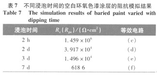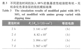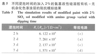 從表3~7可以看出,加入氨基改性硅溶膠的量對環氧改性色漆涂層防腐蝕性能有較大影響。當加入的氨基改性硅溶膠的量較少時,在環氧樹脂基體中生成的納米Si02分散較均勻,說明有了KH-550的作用,生成的Si02與環氧樹脂發生了化學鍵的連接,顆粒與基體間的界而作用增強,從而沒有出現團聚現象。當KH-550的用量增大時,改性環氧涂料的黏度有大幅度的提高,這可能是由于氨基與環氧基團反應所形成的擴鏈的結果。隨著加入的氨基改性硅溶膠的量增大,生成的納米Si02顆粒粒徑逐漸變大,且有可能出現團聚現象,所以其防腐蝕性能會降低[8]。從5個表的涂層擬合結果可以看出,加入5010的氨基改性硅溶膠的環氧改性色漆涂層防腐蝕性能比其他配比有著很大的提高。