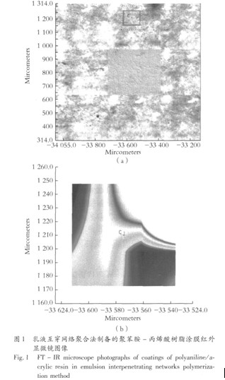 (1)單體的預乳化。按表1中乳化單體的配料比,在250 mL三口燒瓶中,先加水,再加乳化劑攪拌,然后邊攪拌邊滴加混合單體。水浴加熱,控制溫度 (2)丙烯酸樹脂種子乳液的制備。按表1中反應器配料比,將十二烷基苯磺酸鈉、去離子水、過硫酸銨、碳酸氫鈉加入到裝有機械攪拌器、溫度計以及回流冷凝管的500 mL四口瓶中,水浴加熱,升溫至80~ 1.3丙烯酸樹脂乳液的改性 在裝有機械攪拌器,溫度計以及回流冷凝管的1000mL四口燒瓶中加入20%的上述丙烯酸樹脂種子乳液,攪拌并逐漸升溫至 1.4聚苯胺乳液的制備 將乳化劑十二烷基苯磺酸鈉 1.5聚苯胺一丙烯酸樹脂混合涂料的制備 在裝有機械攪拌器,溫度計以及回流冷凝管的500 mL四口燒瓶中加入250 mL上述改性丙烯酸樹脂乳液。將 在250 mL燒瓶中加入50 mL改性丙烯酸樹脂乳液,然后加入聚苯胺乳液。根據制備的聚苯胺乳液中的苯胺含量,控制聚苯胺與丙烯酸樹脂質量比為1:50。加入后劇烈攪拌,共混1h,加入氨水調節pH至7~8,出料。 1.6聚苯胺一丙烯酸樹脂防腐蝕乳液涂膜制備 把 將制得的聚苯胺一丙烯酸樹脂乳液在處理過的馬口鐵片上均勻涂膜,然后放置到干燥箱中升溫至 1.7涂膜結構褒征及防腐性熊測試 1.7.l涂層紅夕卜顯微鏡測試 將在馬口鐵表面制得的聚苯胺一丙烯酸樹脂防腐蝕涂膜用美國PekinElmer公司的Spectrum400紅外顯微鏡系統進行分析,觀察其在紅外顯微鏡下的涂膜均勻性以及聚苯胺在丙烯酸樹脂中的分散性,并測定其紅外光譜。 將馬口鐵片上制備的防腐蝕涂膜在w( NaCl)3.5%的NaCl溶液中用電化學分析儀進行塔菲爾曲線測試。實驗用上海辰華儀器有限公司生產的CHI 2結果與討論 2.1 紅外顯微鏡測試分析 圖1是采用乳液互穿網絡聚合法制備的聚苯胺一丙烯酸樹脂涂膜的紅外顯微鏡照片。