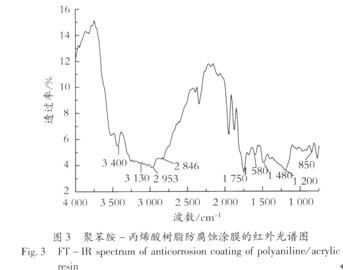 其中圖2(a)是涂膜上一小區域的可見光照片,圖2(b)是圖2(a)中選擇的一個小區域的紅外吸收圖。從圖2中可以看出涂層中深顏色的顆粒較多,說明聚苯胺在丙烯酸樹脂中的分布不均勻。這是由于物理共混物中聚苯胺的粒徑較大,導致聚苯胺在丙烯酸樹脂乳液中不能很好地分散。 圖3是采用乳液互穿網絡聚合法制備的聚苯胺一丙烯酸樹脂涂膜對應的紅外光譜圖。即從圖l(b)中選取一點所做的紅外光譜圖。 從圖3中可以看出,3400cm-1是苯胺中N-H伸縮振動的吸收峰,3130 cm-1是O-H伸縮振動的特征吸收峰,1750cm-1是磺基水楊酸分子中C=0的伸縮振動吸收峰,說明磺基水楊酸已經摻雜到聚苯胺分子鏈中。1480cm-1和1580cm-1分別為苯環和醌環的C=C伸縮振動吸收峰;1200cm-1為C-0伸縮振動吸收峰;850 cm-1是對位二取代苯環的面外彎曲振動特征吸收峰,2953c:m-1、2846cm-1分別是樹脂中甲基和亞甲基伸縮振動的吸收峰。從紅外光譜圖的分析中可以看出,干燥后的涂膜是聚苯胺和丙烯酸樹脂的共混物,且磺基水楊酸已經摻雜到聚苯胺分子鏈中。