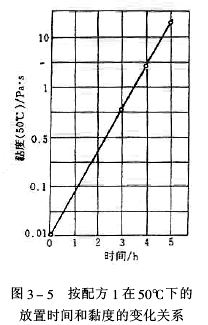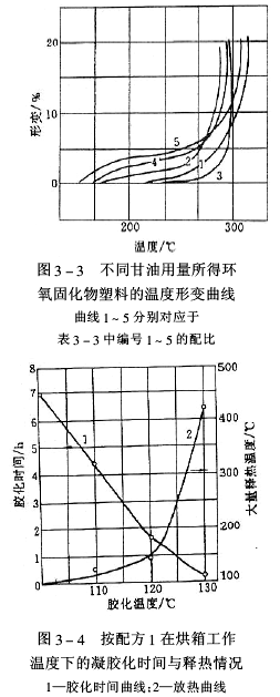 按上述配方在60℃時液體黏度為0.1Pa·s,像清水一樣,其25℃下適用期為1年以上,固化時先在80℃凝膠化,然后分別在120℃、160℃、200℃固化6h,然后再在260℃老化25h,即得耐熱性在300℃以上的塑料,由于使用黏度低,可廣泛地用于澆鑄,做成各種形狀的鑄件。用于浸漬,很容易用于手糊的濕法成型層壓制件上,亦可用于粘合。因其在高溫下有特好的電性能,故廣泛地應用于高級電機工業上和軍工的特需部門,是一種耐熱性極好、強度極高的塑料。 按配方1其凝膠化溫度與凝膠化時間及釋熱情況關系如圖3-4,由此認為膠化溫度應控制在100℃以下為宜。然后再逐步升溫固化。按配方1在50℃下的放置時間約4天,見圖3-5。