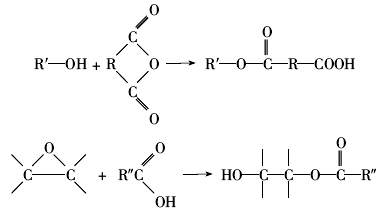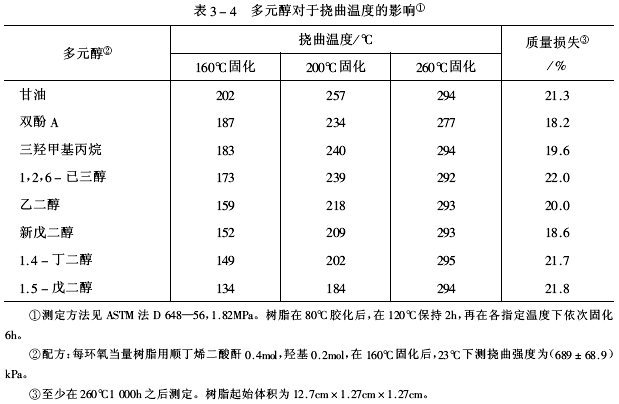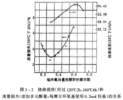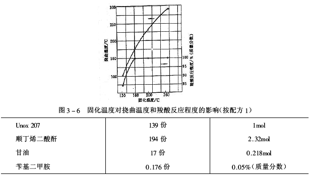 如果酸酐用量比例越高,則熔點越低,在不高的溫度下(40℃)即可成為液體,此液體的使用期能保持1個星期以上。 如改用其他各種多元醇,對于撓曲溫度和質量損失的影響如表3-4所示。 對于不飽和酸酐,如順丁烯二酸酐其固化機理是極復雜的,從圖3-6來看,160℃固化4h幾乎羧酸完全反應了,然而耐熱溫度只在高溫固化后才能提高,可能反應還需按如下反應進行
