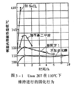 如圖3-1所示,35g Unox 207(包括0.4mol酸酐/環氧當量)混合物,在不加催化劑下于熱空氣(維持110℃)中循環,這個反應非常慢,在19h內不能凝膠化,但加了三甲羥基丙烷(見配方1)則大量釋熱(可用示差熱分析法測定)5h便凝膠化了,如果添加少量的芐基二甲胺或氯化物則反應速度更快,加入多元醇可起到催化和增加交聯密度的作用。