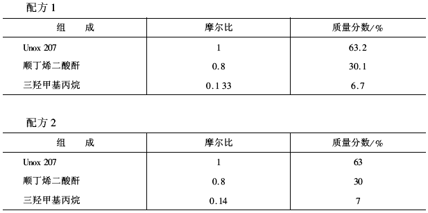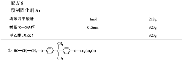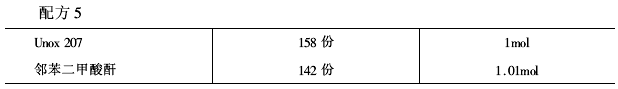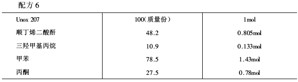 在165℃攪拌下固化15min即得B階段樹脂,可用于涂料及層壓制品。 配方8是用均苯四甲酸酐和多元醇組成的B階段樹脂,能用于作層壓制品、黏合劑及涂料。 配方8