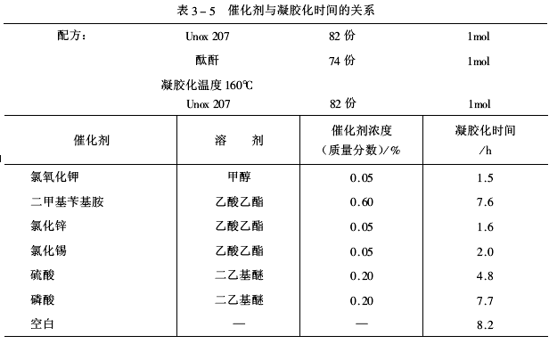 KOH質量分數為0.04%(乙醇為溶劑)120℃時得一均勻熔體,在160℃固化11h,前5h形成凝膠化,得到不熔樹脂其熱扭變溫度為196℃,布氏硬度46。 其固化催化劑除芐基二甲胺、四氯化錫外,還有二乙基鋅一醇系化合物[m(二乙基鋅):m(醇)=1.0~2.0為宜,且用一級醇為好]。 固化催化劑還可應用無機酸和堿,各類催化劑與凝膠化時間的關系如表3-5。