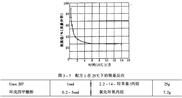 其中以氫氧化鉀、氯化鋅、氯化錫催化作用最強,如果有多元醇存在則作用更猛烈,可大大加速固化的完成。 (2)B階段樹脂生產 B階段樹脂是部分固化易熔的樹脂,有多方面的重要用途,做成B階段樹脂溶液,特別適用于干法成型的層壓制件,也可作涂料,黏合劑,固體粉碎后作粉末涂料、壓塑粉,且塑化前具很長的使用期。 按配方1在25℃下保存,圖3-7指出1~2個月后其羧基含量降到原來35%~40%,而1年后降到23%,這樹脂就是B階段樹脂,加熱易熔,一般因生產B階段樹脂時放熱很大,必須在惰性溶劑中反應。