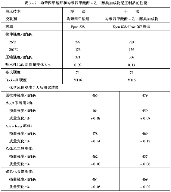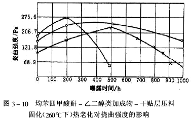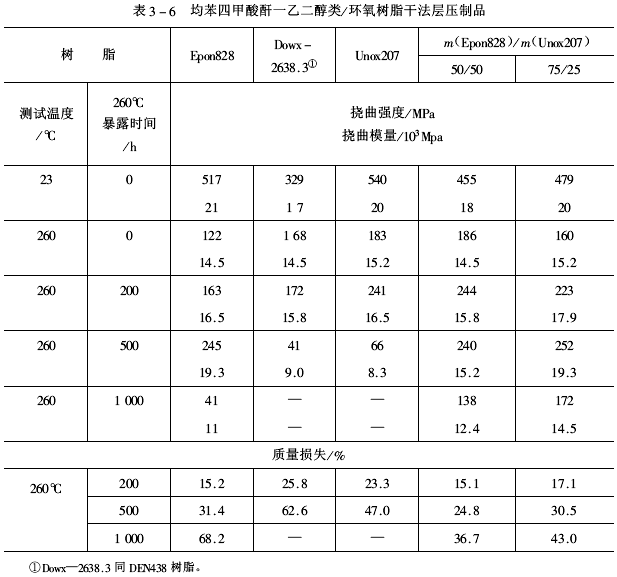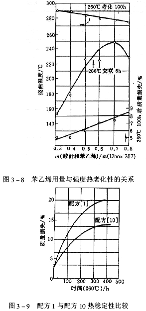 先將前三物在80℃熔解均勻,然后冷至35℃加入苯乙烯和過氧化苯甲酰,先在50℃下凝膠化40min,然后即可升溫至140℃固化。 酸酐和苯乙烯摩爾用量一樣,對于每環氧當量樹脂來說用0.4mol為宜,見圖3-8。 配方1與配方10(加苯乙烯)其熱穩定性比較見圖3-9。 由此可知加了苯乙烯單體后,Unox 207熱穩定性得到了顯著的改進。配方2與雙酚A環氧樹脂混用:按配方8所得到的層壓制品其在樹脂23℃,260℃下撓曲強度和模量都要比按同樣配方的雙酚A環氧樹脂Epon 828高得多,但其缺點是260℃,500h后層壓制品強度上有顯著降低,但若按配方8 Unox 207與雙酚A環氧樹脂摻用,如Epon828/Unox 207用量為50/50,75/25 時大大彌補了Unox 207的缺點,在260℃使用1000h后層壓制品撓曲強度仍有137.8MPa,熱穩定性大為提高(質量損失減少見表3-6,圖3-10)且不少性能方面超過了雙酚A環氧樹脂。加成物層壓制品性能見表3-7。