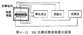 二、DSC法在環氧樹脂固化反應研究中的應用 用TSC法研究環氧樹脂已有少數報道。中國科學院化學研究所蔡維真等曾用TSC法研究了環氧樹脂的熱激松弛行為,并以有機玻璃(PMMA)線性聚合物作對照,發現交聯環氧樹脂的玻璃化轉變過程的松弛時間分布具有單一型的特征,認為這是由于交聯結構對其分子運動約束而造成的“均一”化運動單元與運動模式。T.D.Chang等研究了交聯度以及老化對環氧樹脂物理性能的影響,尤其是以DDS作交聯劑的環氧系統,同時,還研究了它們的次級松弛(β,α)行為。 交聯環氧樹脂是一種玻璃態聚合物。通過一系列實驗,研究環氧樹脂體系各組分(樹脂、固化劑、促進劑)的含量和“后固化”條件對其玻璃化溫度(Tg)值的影響,以及計算活化能、松弛時間等。 (一)實驗方法 (1)儀器裝置測試裝置示意如圖4-12。