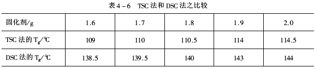 (2)簡單測試步驟 ①在熱釋電儀上、下電極之間放入樣品。 ②將樣品和電極經反復抽真空、充氮氣,以防氧化。 ③加熱到極化溫度(Tp),維持一段時間(tp)。 ④施加直流高電壓(Vp)。 ⑤先凍結樣品。再撤去外電場。 ⑥程序升溫加熱樣品。經“微電流儀”放大的熱釋電流及其相應的溫度,在記錄儀上繪成TSC溫度譜。 (二)結果和討論 (1)環氧樹脂體系各組分的變化對Tg值的影響(見表4-6)