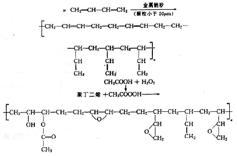 一、合成 丁二烯以金屬鈉砂為催化劑在無水苯溶劑中進行聚合,可以制得低分子量液體聚丁二烯,如果要制得分子量更低的聚丁二烯,可在苯溶劑中加入一定量的甲苯調(diào)節(jié)劑。液體聚丁烯中含有不少不飽和雙鍵,通過過氧化乙酸氧化反應后就能制成環(huán)氧化聚丁二烯,其反應式如下: