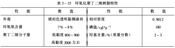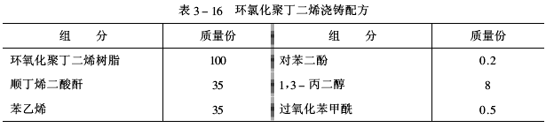 二、性能和用途 環(huán)氧化聚丁二烯易溶于苯、甲苯、乙醇、丙酮、汽油等溶劑,易與一般酸酐類固化劑反應,和胺類固化劑也能發(fā)生反應。固化后的產(chǎn)物具有良好的熱穩(wěn)定性、黏合性、耐氣候性及電絕緣性,層壓材料具有突出的抗沖擊性/ 但固化后產(chǎn)物收縮率較大,這是它的缺點。 聚丁二烯主要應用在制造澆鑄件、玻璃鋼、黏合劑、電器密封、涂料以及改性其他環(huán)氧樹脂等方面。 從環(huán)氧化聚丁二烯結(jié)構(gòu)中可以看到樹脂中除了有環(huán)氧基之外還有殘留的雙鍵,為了使它較徹底的固化,在使用時除了采用酸酐外還使用過氧化物。典型的配方如表3-16。