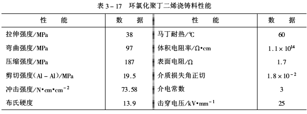 澆鑄料組成物配制方法:將對苯二酚加入到丙二醇中攪拌至互溶后再加入環(huán)氧化聚丁二烯,然后攪拌下加熱到70℃,再加入苯乙烯、順丁烯二酸酐、過氧化苯甲酰,在50℃下攪拌至互溶。用真空脫盡組成物中的氣泡后進行澆鑄。按以下固化條件進行處理:80℃/2h+120℃/2h+150℃/12h。固化產(chǎn)物性能見表3-17。