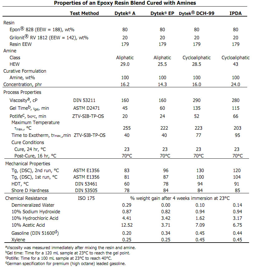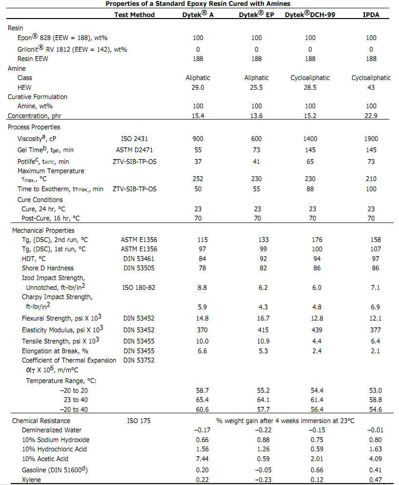 Table 1 summarizes the process properties, mechanical properties, and chemical resistance of Epon® 828 resin cured with Dytek® A and Dytek® EP diamines and with Dytek® DCH-99 and IPDA.