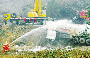 10月20日22時許,307國道[GuoDao]井陘三合[SanHe]莊村段,一輛重型半掛牽引車與一輛裝載30噸焦化甲苯的罐車相撞,導致罐車失控翻入路邊5米深河溝[HeGou]內,兩名駕駛員受傷。因空氣中有異味,懷疑甲苯(有毒,且易燃易爆)泄漏,井陘縣有關部門立即組織警力對307國道[GuoDao]實施交通管制,并疏散現場[XianChang]周圍一公里內的村民。