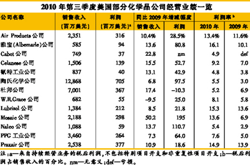 對(duì)美國(guó)和歐洲化學(xué)品公司[GongSi]來(lái)說(shuō),今年第三季度[JiDu]無(wú)疑又是一個(gè)經(jīng)營(yíng)亮點(diǎn)頻現(xiàn)的季度[JiDu]。在第二季度[JiDu]業(yè)績(jī)改善的基礎(chǔ)上,本季度[JiDu]的行業(yè)銷售[XiaoShou]和贏利繼續(xù)攀升。這種喜人的局面讓化學(xué)品公司[GongSi]的高管們更是增添了幾分信心:經(jīng)濟(jì)衰退正在漸行漸遠(yuǎn)。 迄今為止,在發(fā)布季報(bào)的化學(xué)品公司[GongSi]中,大多數(shù)公司[GongSi]的季度[JiDu]銷售[XiaoShou]額同比增長(zhǎng)了10%~20%,而它們的贏利則大幅飆升。美國(guó)空氣化工產(chǎn)品有限公司[GongSi](Air Products & Chemicals)、雅寶(Albemarle)公司[GongSi]、Cabot公司[GongSi]、Celanese公司[GongSi]、氰特工業(yè)(Cytec Industries)公司[GongSi]、陶氏化學(xué)公司[GongSi]、格雷斯(W.R. Grace)公司[GongSi]、路博潤(rùn)(Lubrizol)公司[GongSi]、納爾科(Nalco)公司[GongSi]、PPG工業(yè)(PPG Industries)公司[GongSi]和普萊克斯(Praxair)公司[GongSi]的經(jīng)營(yíng)業(yè)績(jī)幾乎與它們?cè)诮衲甑诙径萚JiDu]的業(yè)績(jī)相同,當(dāng)時(shí)整個(gè)行業(yè)跳出了經(jīng)濟(jì)衰退的低谷。 第三季度[JiDu],陶氏公司[GongSi]實(shí)現(xiàn)利潤(rùn)7.05億美元,幾乎比上年同期翻了一番,而這要得益于亞洲經(jīng)濟(jì)開(kāi)始復(fù)蘇以及這種復(fù)蘇趨勢(shì)現(xiàn)在正對(duì)西方經(jīng)濟(jì)產(chǎn)生影響。今年第二季度[JiDu],陶氏賺得了7.07億美元的利潤(rùn)。 陶氏首席執(zhí)行官Andrew Liveris在贏利報(bào)告中稱:“隨著北美和歐洲地區(qū)的需求復(fù)蘇繼續(xù)呈現(xiàn)強(qiáng)勁態(tài)勢(shì),以及新興市場(chǎng)的發(fā)展動(dòng)力十足,我們?cè)谒薪?jīng)營(yíng)領(lǐng)域里的業(yè)務(wù)收入都在強(qiáng)勁增長(zhǎng),在全球每一個(gè)銷售[XiaoShou]地區(qū)也是如此。第三季度[JiDu],新興市場(chǎng)給我們創(chuàng)造了40多億美元的銷售[XiaoShou]收入。”(文章來(lái)源環(huán)球聚氨酯網(wǎng)) 根據(jù)陶氏公司[GongSi]的報(bào)告,第三季度[JiDu],公司[GongSi]銷售[XiaoShou]收入溫和增長(zhǎng)了6.8%,但是,如果將公司[GongSi]在兩家海外合資企業(yè)中的股份剝離排除在外,那么陶氏第三季度[JiDu]的銷售[XiaoShou]增長(zhǎng)率躍升至23.4%。其中14%得益于銷售[XiaoShou]量,9%得益于產(chǎn)品價(jià)格的上漲。 市場(chǎng)分析人士注意到,本季度[JiDu]陶氏的開(kāi)工率提升到86%,比上個(gè)季度[JiDu]提高了6%。陶氏每股54美分的贏利比市場(chǎng)分析人士的一致預(yù)期高出13美分。花旗集團(tuán)股票分析師P. J. Juvekar在給投資者的一份報(bào)告中寫(xiě)道,陶氏的高性能產(chǎn)品、基礎(chǔ)塑料和基礎(chǔ)化學(xué)品部門實(shí)現(xiàn)的利潤(rùn)都要好于他的預(yù)測(cè)。 第三季度[JiDu],杜邦公司[GongSi]每股贏利為40美分,低于去年同期的水平,這主要是由于藥品專利到期導(dǎo)致許可交易收入減少。盡管如此,公司[GongSi]每股贏利還是比市場(chǎng)分析人士的一致預(yù)期高出6美分。得益于銷售[XiaoShou]量提高14%,該公司[GongSi]第三季度[JiDu]的銷售[XiaoShou]收入比上年同期增長(zhǎng)了17.4%,達(dá)到70億美元。 在德國(guó),化學(xué)品巨頭巴斯夫和拜耳公司[GongSi]都報(bào)告說(shuō),公司[GongSi]的銷售[XiaoShou]收入和利潤(rùn)比上年同期強(qiáng)勁增長(zhǎng)。其中,巴斯夫的銷售[XiaoShou]收入為289億美元,同比增長(zhǎng)了23%,利潤(rùn)增加了13.9億美元,達(dá)到15.5億美元;拜耳銷售[XiaoShou]了價(jià)值119億美元的產(chǎn)品,比上年同期增長(zhǎng)16.1%,利潤(rùn)增長(zhǎng)了24.2%,達(dá)到3.45億美元。 與美國(guó)Air Products、Celanese、杜邦、Grace、Lubrizol、Nalco和Praxair公司[GongSi]一樣,巴斯夫和拜耳公司[GongSi]都提高了它們對(duì)全年贏利的預(yù)測(cè)。 |