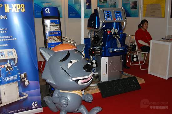 環(huán)球聚氨酯[JuAnZhi]網(wǎng)11月12日訊 記者[JiZhe]昨日來(lái)到2010年上海噴涂[PenTu]聚脲技術(shù)與應(yīng)用展覽會(huì)采訪[CaiFang],在一排排鱗次櫛比的展臺(tái)中參觀,但印象深刻的當(dāng)屬那個(gè)一臉奸笑、腦戴破帽、臉上還有一條刀疤的“好男人”——灰太狼。 出于好奇,記者[JiZhe]按下快門(mén)記下了灰太狼的瞬間。