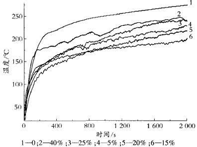 基料樹脂由環氧[HuanYang]乳液和固化劑[GuHuaJi]組成,在一定范圍內通過兩者比例的調整可以改變基料樹脂性能[XingNen]。在其他參數保持不變的條件下制備了6組防火[FangHuo]涂料,固化劑[GuHuaJi]占乳液含量分別為0、5%、15%、20%、25%和40%。圖1是涂覆了這幾種防火[FangHuo]涂料的樣板在燃燒測試中鋼板背溫隨受熱時間變化的曲線,表1是這幾種涂層所生成的炭化層性能[XingNen]對比。