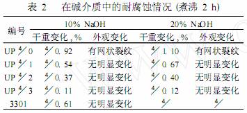 (2)試驗(yàn)內(nèi)容 將樣品按GB3194-87不飽和聚酯[JuZhi]樹(shù)脂[ShuZhi]澆注體耐堿性測(cè)定方法做耐腐蝕性實(shí)驗(yàn),結(jié)果見(jiàn)表2。